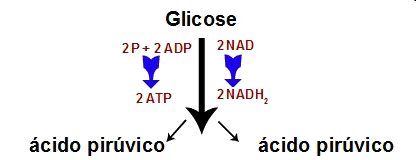 A glicólise é um processo químico no qual fosfatos (P) são incorporados à molécula de glicose, favorecendo a sua quebra em duas moléculas de ácido pirúvico, como na equação representada a seguir.